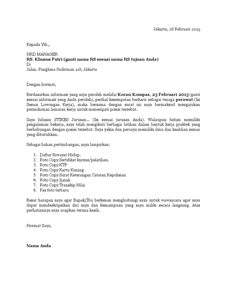 Sebelum ke pembahasan utama mengenai contoh surat lamaran kerja , sebaiknya kita ketahui terlebih dahulu format, cara, dan tips dalam penulisan surat lamaran kerja. Contoh surat lamaran kerja dalam bahasa inggris i. Saya doakan agar mendapatkan posisi yang tepat sesuai kemampuanmu. Tersedia dalam bahasa indonesia dan bahasa inggris. Saya akan memberikan contoh surat lamaran kerja yang baik dan benar. Surat lamaran kerja umum biasanya digunakan untuk melamar sebuah pekerjaan pada sekolah, perusahaan ( pt ), bimbingan belajar dan. Pada dasarnya membuat surat lamaran kerja tidak sesulit yang dibayangkan, dengan format, contoh dan referensi yang tepat semua. Akan tetapi, tak sedikit yang sulit membuatnya mengingat banyak faktor yang harus diperhatikan. Jika anda membutukan contoh surat lamaran kerja umum, anda bisa coba baca beberapa referensi yang telah kami buat dari text dan dengan gambar. Dokumen kerja pertama kali diliat adalah surat lamaranmu, jangan sampai hrd kecewa, berikut contoh surat lamaran kerja yang baik dan benar. Hal ini agar surat lamaran kerja anda dilirik oleh pihak perusahaan. Contoh surat lamaran kerja di rumah sakit. Berikut contoh surat lamaran pekerjaan yang bisa kamu download file dokumennya juga, link di bagian akhir artikel.
